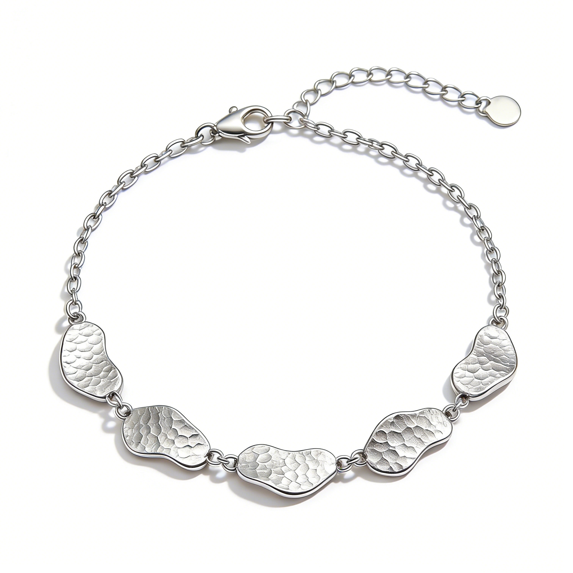 This striking bracelet showcases an artisanal design featuring irregular hammered metal pieces arranged in a dynamic patchwork pattern. Each segment is individually crafted with textured detailing, creating visual depth and movement along the wrist. The polished silver finish catches light beautifully, making it an elegant statement piece that transitions seamlessly from day to evening wear. Perfect for those who appreciate contemporary jewelry with handcrafted character and understated luxury.