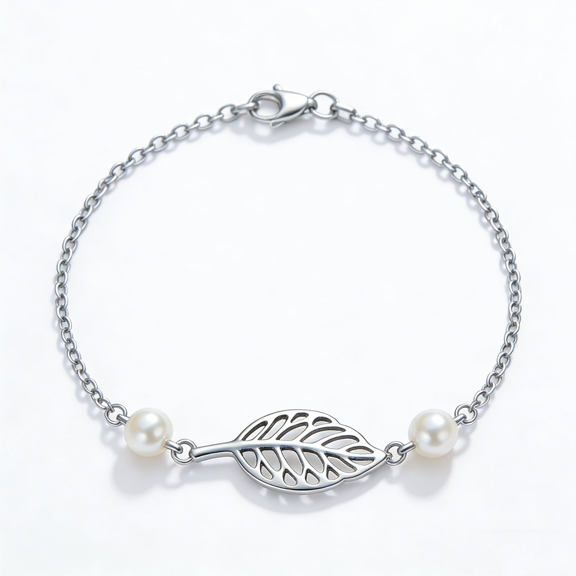 Delicate craftsmanship meets understated elegance in this minimalist silver bracelet. Featuring a striking hollow leaf design paired with lustrous double pearls, this piece captures refined simplicity. The polished silver complements the organic leaf motif while the pearls add a touch of timeless sophistication. Perfect for layering or wearing solo, this bracelet transitions effortlessly from day to evening, making it an essential addition to any jewelry collection.