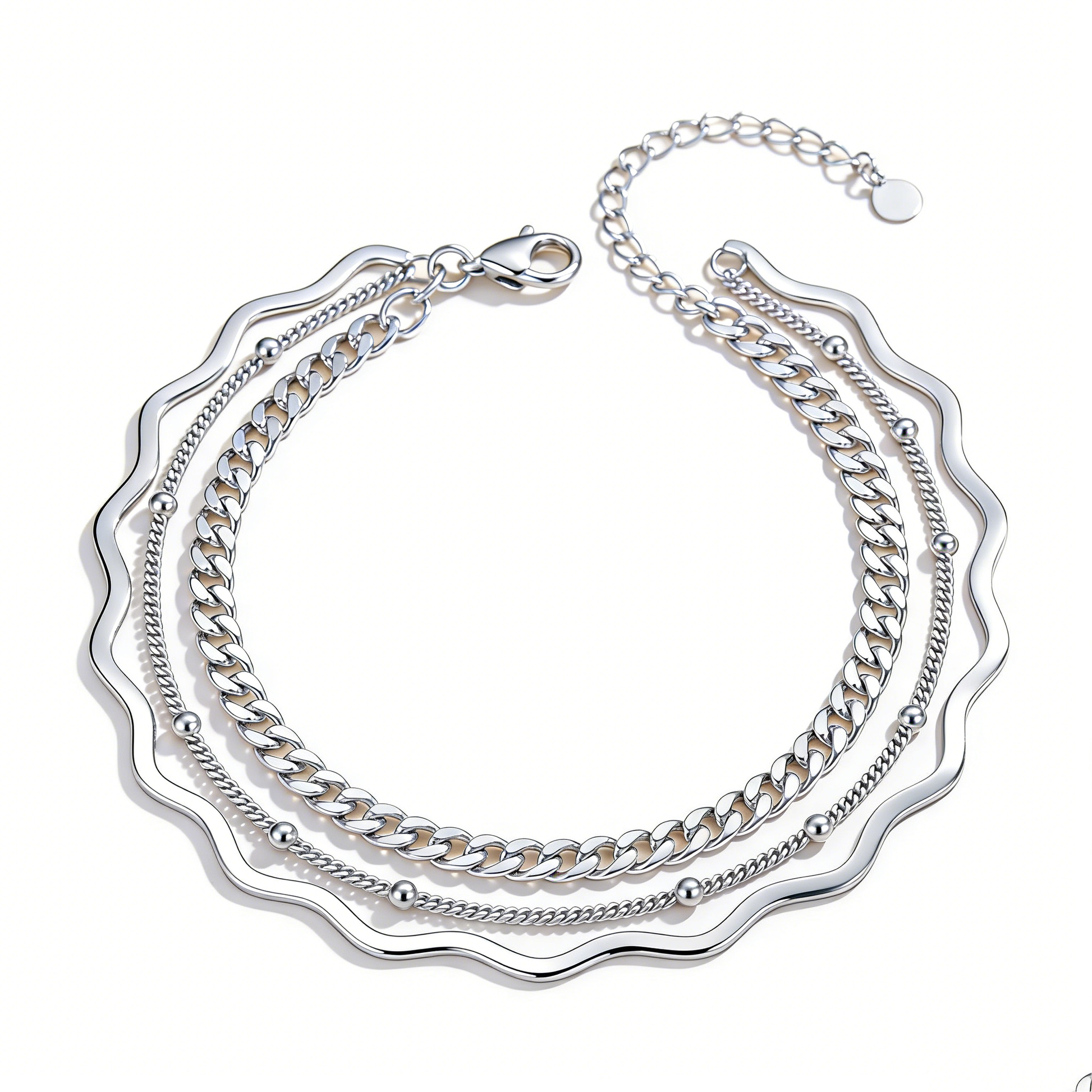 Elevate your everyday elegance with this refined multi-layer silver necklace, featuring gracefully undulating wavy edges that catch the light with subtle sophistication. The cascading layered design creates dimensional depth while maintaining a streamlined silhouette, making it versatile enough for both professional settings and evening occasions. Crafted with attention to detail, this piece effortlessly transitions from day to night, adding a touch of understated luxury to any ensemble.