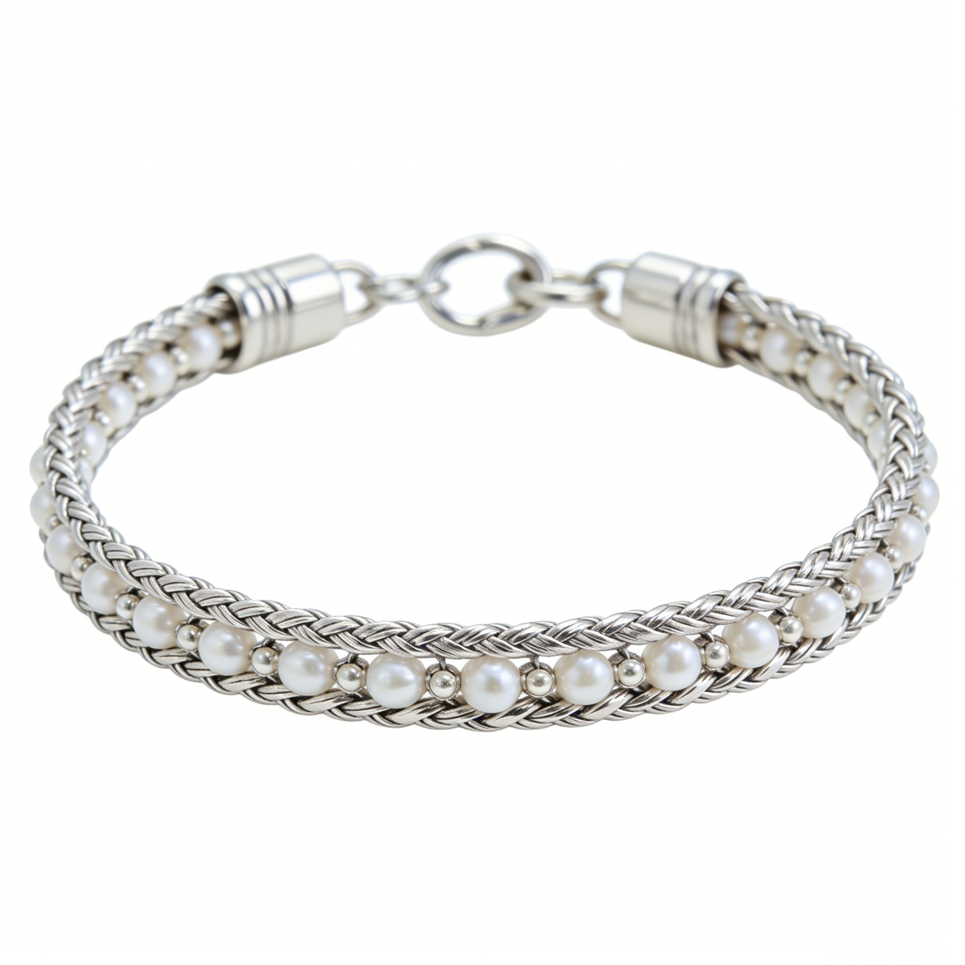 Woven Wide Small Pearl Inlaid Luxury Silver Bracelet